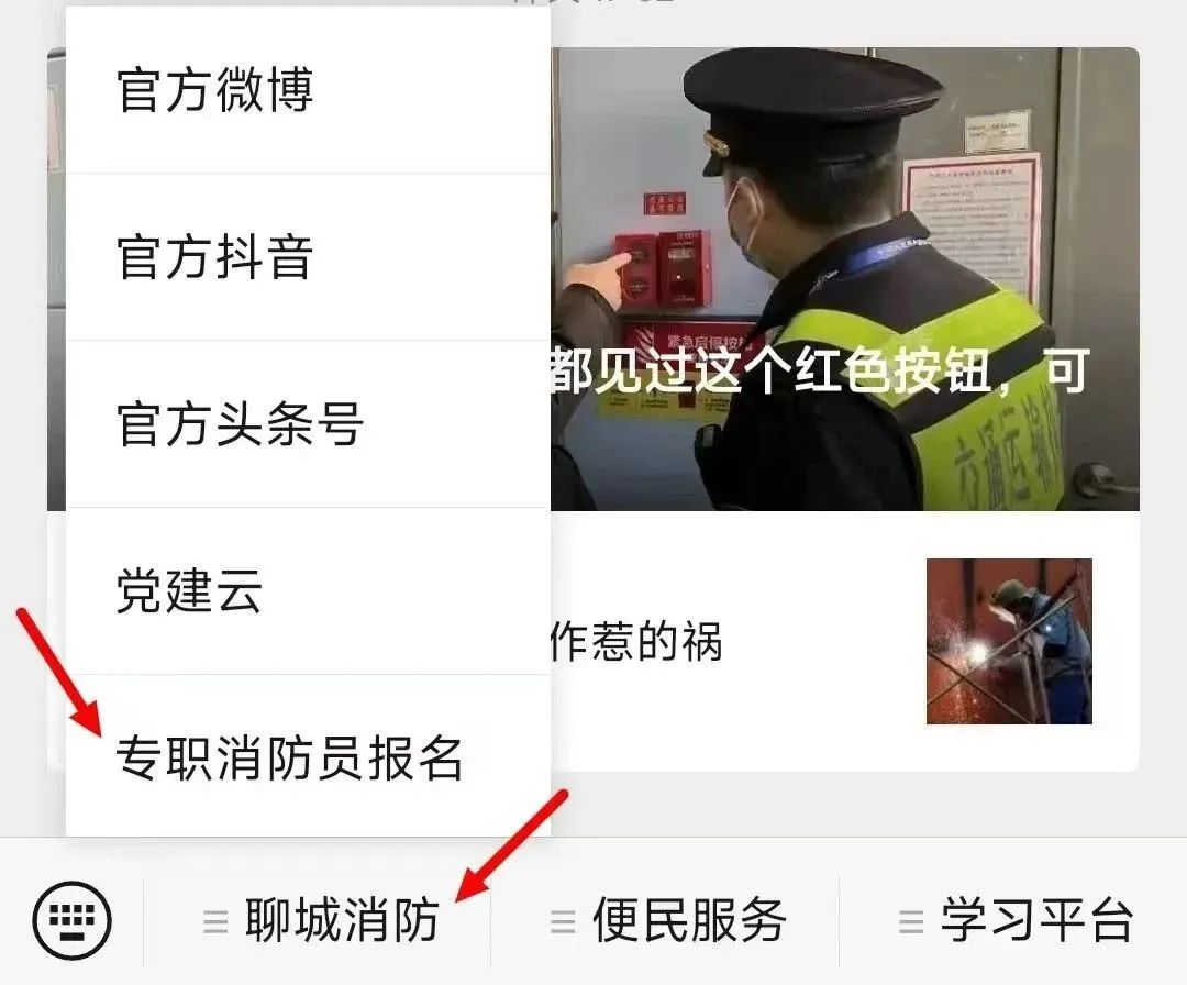 打开公众号,点击下方“聊城消防”栏目——点击“专职消防员报名”子栏目——填写报名表——保存提交。